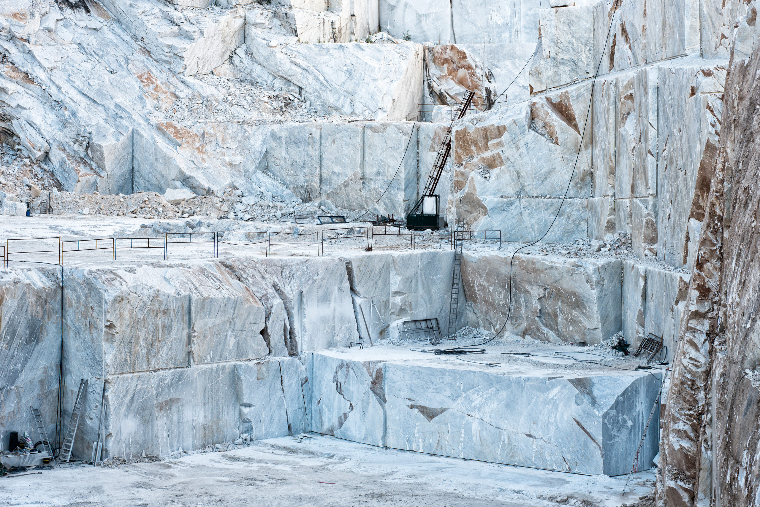 Open cast mine pit with white Carrara marble – Open cast mine pit with white Carrara marble being cut into rectangular blocks for the construction industry and sculptures in Tuscany,...
