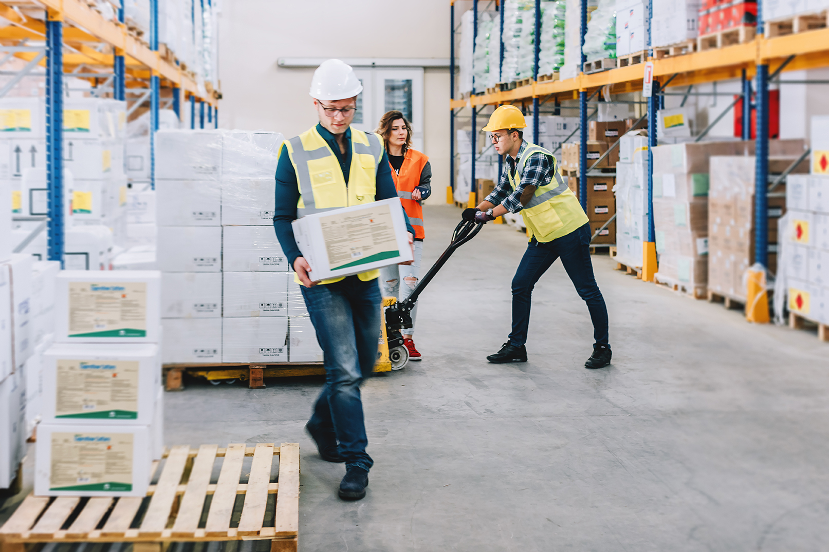 Warehouse employees working with boxes – Manual workers and technician checking and carrying boxes down in the large warehouse interior...